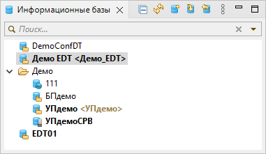 расположено в верхней части панели. 1C:EDT автоматически отфильтрует список и оставит в нем только подходящие базы.