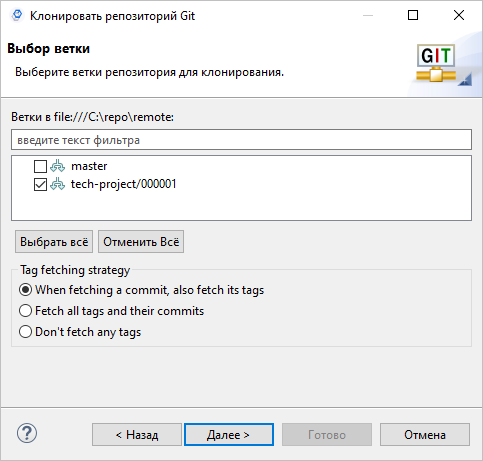 (Клонировать репозиторий Git). Для разработки ему нужна только ветка tech-project/000001, поэтому в мастере клонирования репозитория он отмечает только ее.
