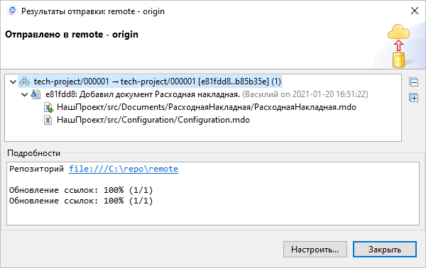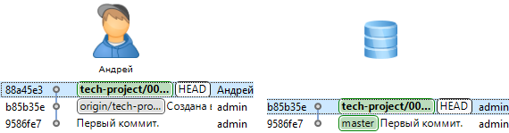 Теперь указатель origin/tech-project/000001 доступен из ветки tech-project/000001 Василия, так что он может спокойно отправить изменения на сервер (полагая, что Андрей не выкладывал свои изменения за это время):
