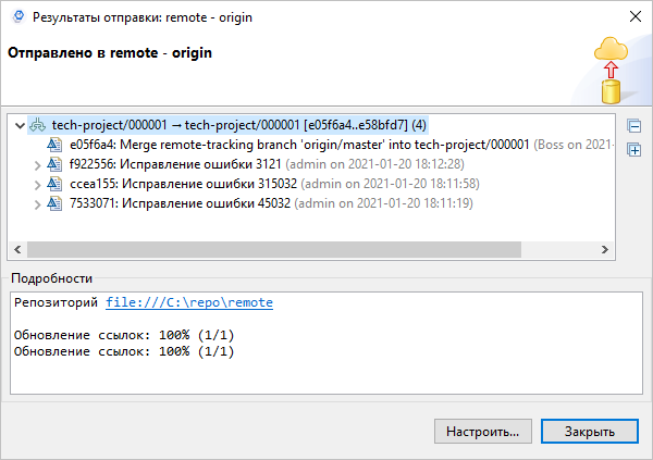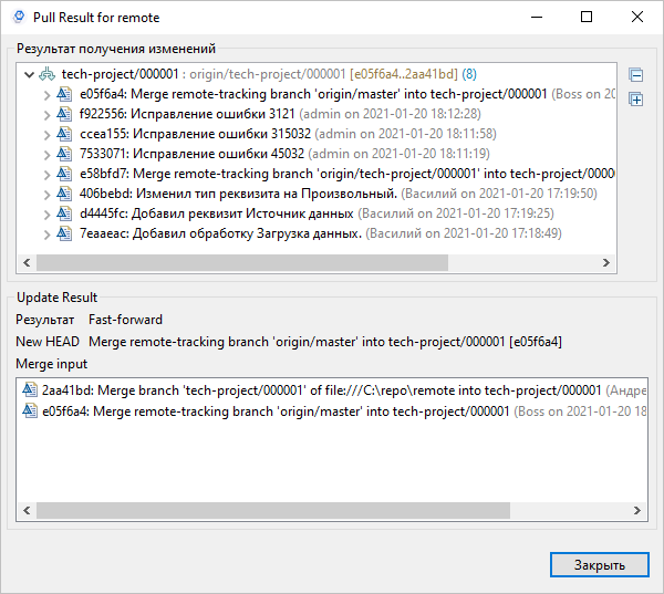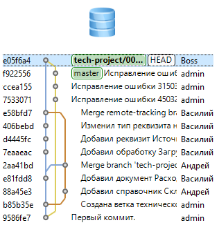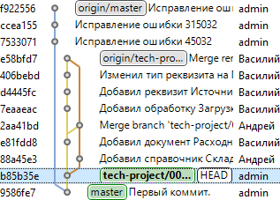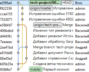 При этом, как вы видите, в ветку master будут получены изменения, выполненные в основном хранилище, и перенесенные в репозиторий автоматически, конфигурацией 1С:ГитКонвертер. А в ветку tech-project/000001 будут получены изменения, выполненные за это время Андреем и Василием.