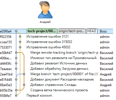 В результате история коммитов Андрея выглядит, как показано на рисунке: