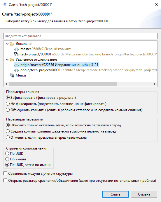 Теперь он может влить удаленную ветку origin/master в свою локальную ветку tech-project/000001, чтобы объединить локальную ветку с изменениями, появившимися в основном хранилище.