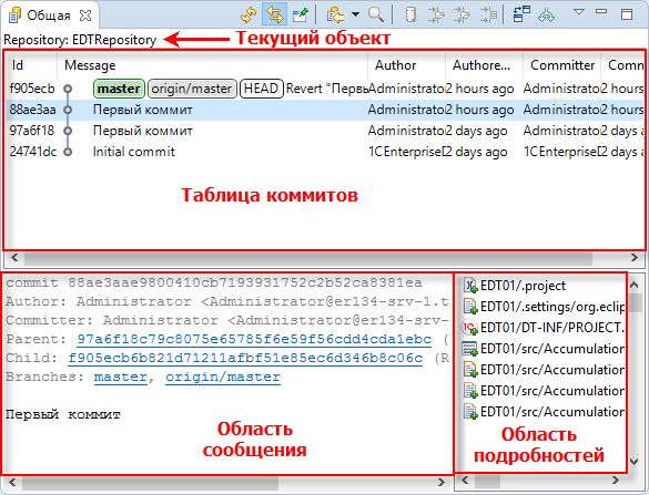 Область сообщения показывает сообщение коммита и другую информацию, связанную с коммитом, который выделен в таблице. Кроме этого, если выделить файл в области подробностей, то в области сообщения 1C:EDT покажет изменения выделенного файла по сравнению с его предыдущим состоянием.