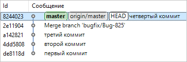 В верхней части панели находится таблица коммитов. Коммиты расположены в ней в обратном хронологическом порядке — самый новый коммит находится вверху.