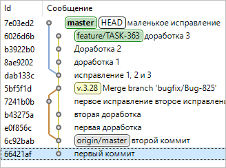 Во второй колонке таблицы находится граф коммитов. Он показывает отношение родительских и дочерних коммитов в списке. Каждый коммит имеет хотя бы одного родителя, за исключением самого первого коммита.