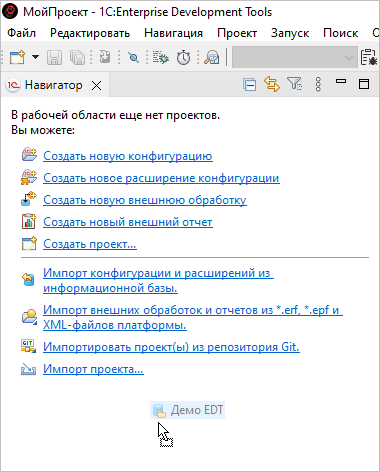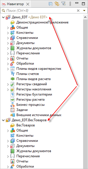 В результате в панели Навигатор будет открыт новый проект, содержащий импортированную конфигурацию. Рядом с ним будут открыты проекты расширений (на каждое расширение свой проект). Их названия в качестве префикса будут содержать имя родительского проекта.