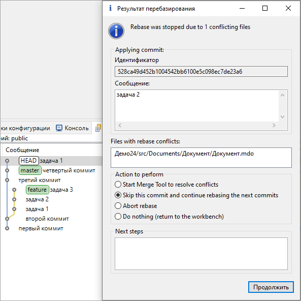 Вы выбрали вариант Skip this commit and continue rebasing the next