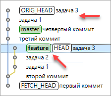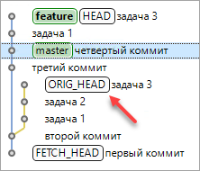командной панели. После этого в истории появится ссылка ORIG_HEAD, которая указывает на тот коммит, на котором находился