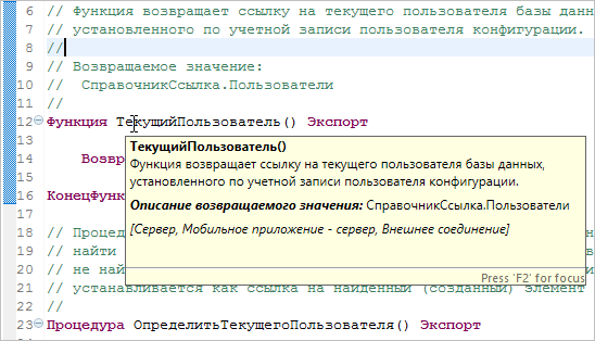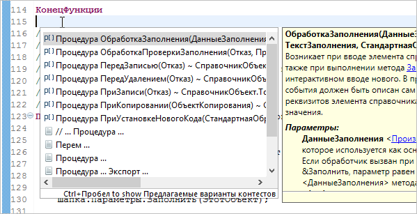 Синтаксическая помощь автоматически показывается в контекстной подсказке при редактировании модулей конфигурации.