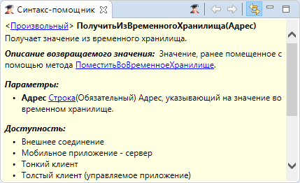 Панель заполняется данными автоматически в том случае, если включена связь с редактором. 1C:EDT анализирует текущий идентификатор, который находится под курсором в редакторе встроенного языка, и если для него существует синтаксическая подсказка — показывает ее.