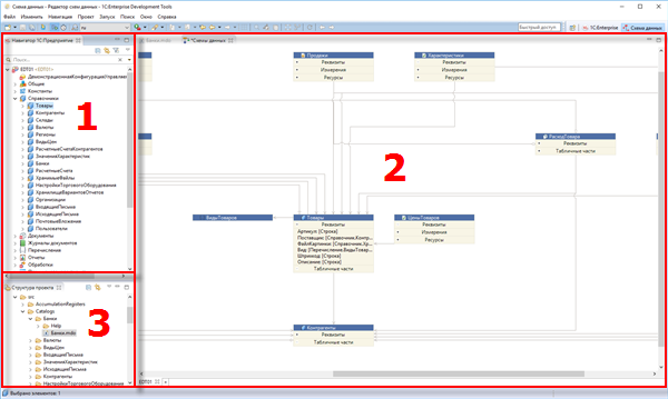 Схема данных, как и дерево объектов конфигурации, предназначена для того, чтобы представить вам все приложение. Однако для этого она использует другую модель визуализации, в которой структуры данных представляются в виде так называемой ER-диаграммы (Entity Relationship Diagram).