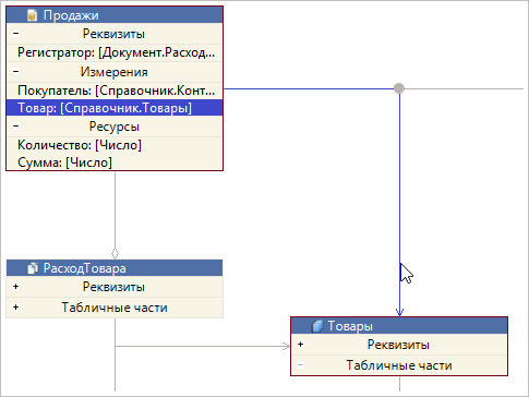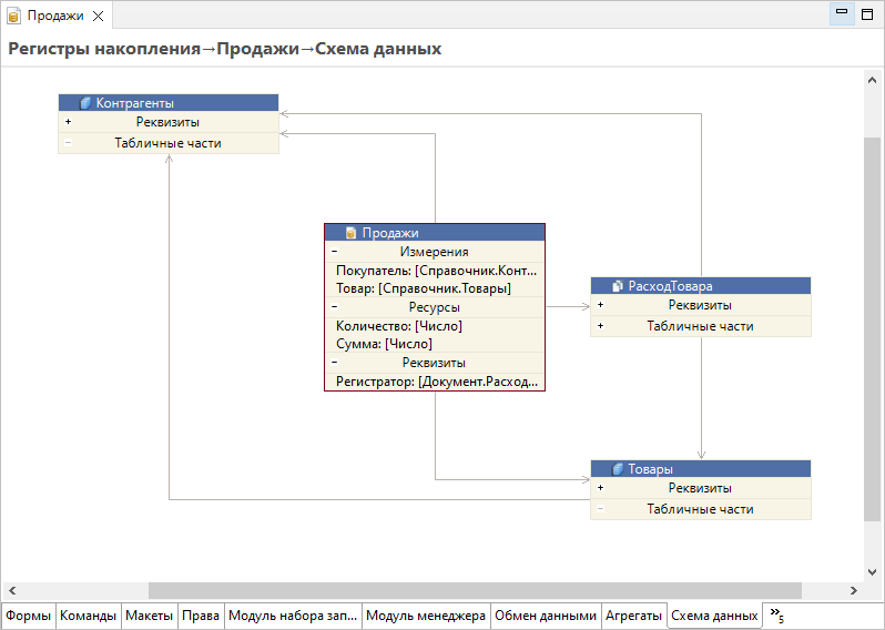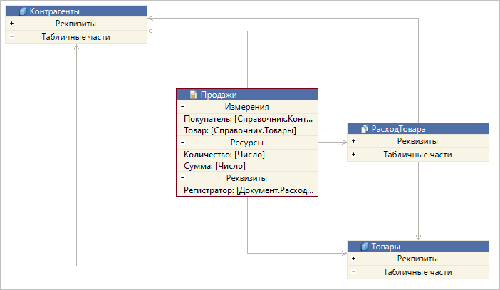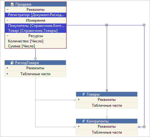 На этой схеме данных видно, что регистр Продажи использует документ РасходТовара и справочники Товары и Контрагенты. Эти связи исходят из регистра. Кроме того, на схеме показаны и взаимные связи между самими используемыми объектами (между документом и справочниками).