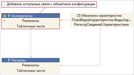 В результате схема примет более простой вид, из которого будет понятно, что справочник Регионы используется только справочником Контрагенты. Но кроме этого, как и подавляющее большинство объектов этого приложения, он задействован в механизме характеристик. Подробности этого механизма в данном случае неважны.