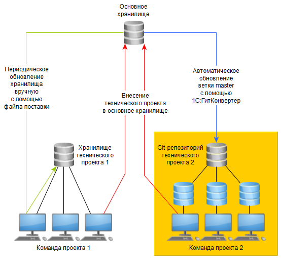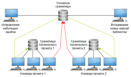 Команда проекта 1 работает по-старому. У нее есть хранилище технического проекта 1, в котором она ведет свою разработку, и которое она периодически обновляет до состояния основного хранилища. В конце разработки команда проекта 1 вносит свои изменения в основное хранилище.
