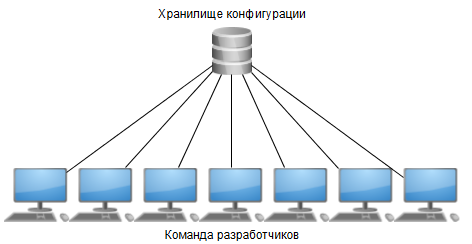Общий принцип групповой разработки заключается в следующем. Создается хранилище конфигурации, в которое помещается разрабатываемая конфигурация. Каждый человек из команды разработчиков подключает свою информационную базу к этому хранилищу, захватывает нужные ему объекты и изменяет их. Затем он помещает их обратно в хранилище и освобождает, чтобы другие разработчики тоже могли изменить их.