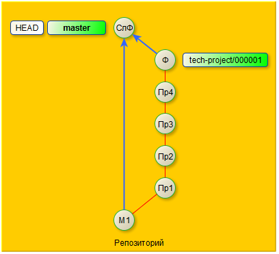 Для хранения изменений проекта создается отдельная ветка, на рисунке она называется tech-project/000001. В этой ветке разработчики изменяют конфигурацию (коммиты Пр1, Пр2, Пр3, Пр4, Ф, «Пр» значит «правка», «Ф» значит «финал»).