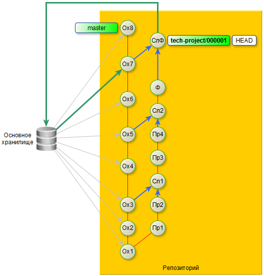 Когда разработка проекта закончена и он протестирован (коммит Ф), конфигурацию из ветки tech-project/000001 необходимо внести в основное хранилище. Для этого в ветку master импортируется последнее состояние основного хранилища (коммит Ох7) и ветка master вливается в ветку tech-project/000001 (коммит СлФ).