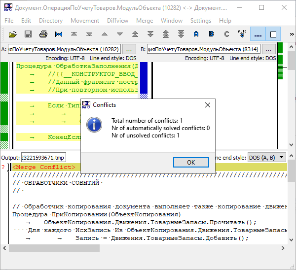 Он учитывает семантику встроенного языка и может определять перемещение фрагментов кода (процедур и функций) внутри модуля. В результате вы не просто видите, что строки одного модуля отличаются от строк другого, а понимаете, что в принципе модуль не изменился, изменилось лишь положение процедур внутри него.