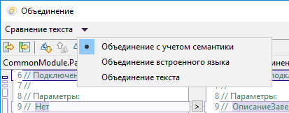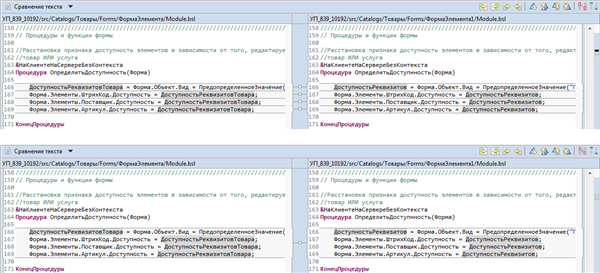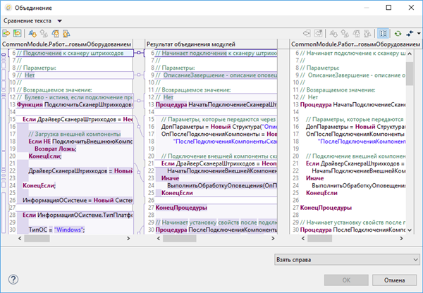 Редактор сравнения и объединения текстовых файлов можно использовать, например, для сравнения двух общих модулей. Также мы интегрировали его в редактор сравнения и объединения конфигураций, поэтому при сравнении модулей будет также использоваться этот редактор.