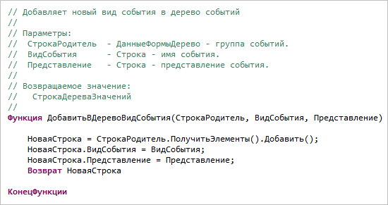 В комментарии перечисляются параметры, их типы и назначение, тип и назначение возвращаемого значения.