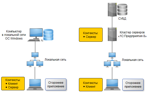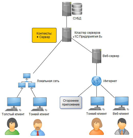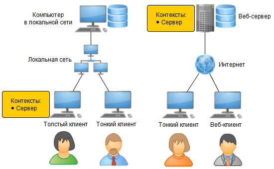 В случае клиент-серверной базы код на встроенном языке исполняется на компьютере кластера серверов.