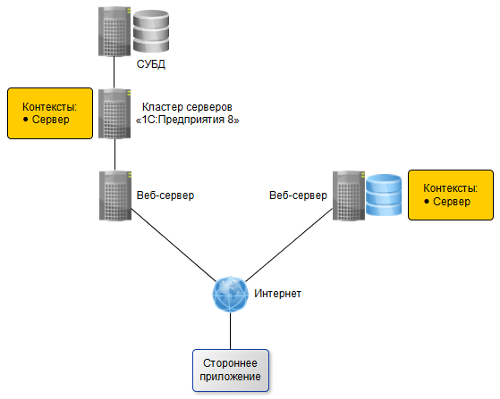Web-сервисы всегда исполняются в контексте сервера. Исполнение Web-сервиса начинается в результате того, что стороннее приложение обращается к операции Web-сервиса, который опубликован на веб-сервере. Можно опубликовать Web-сервис как файловой, так и клиент-серверной информационной базы.