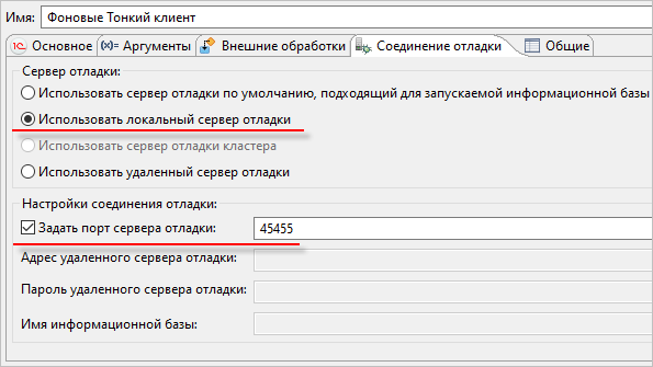 Для отладки некоторых компонентов приложения вам может понадобиться конфигурация запуска, которая использует локальный сервер отладки, запущенный на конкретном порту. Для примера — на порту 45455.