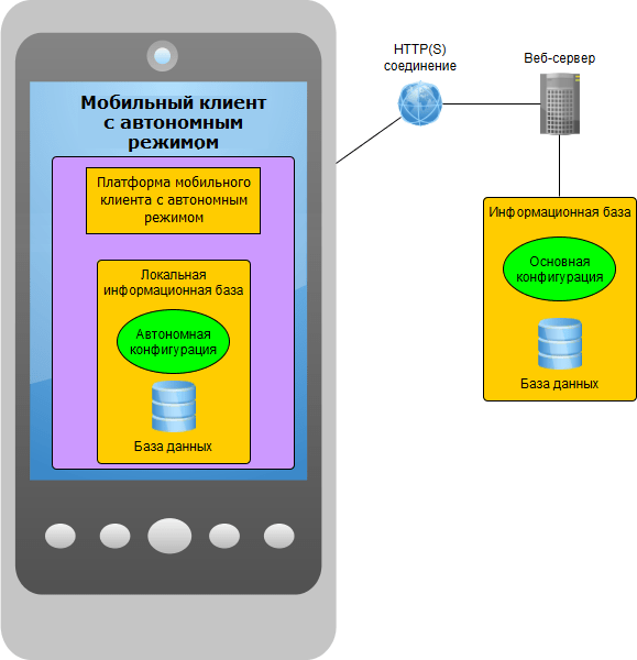 Если проводить аналогию с настольной версией «1С:Предприятия», то мобильный клиент является аналогом тонкого клиента, работающего с базой, опубликованной на веб-сервере.
