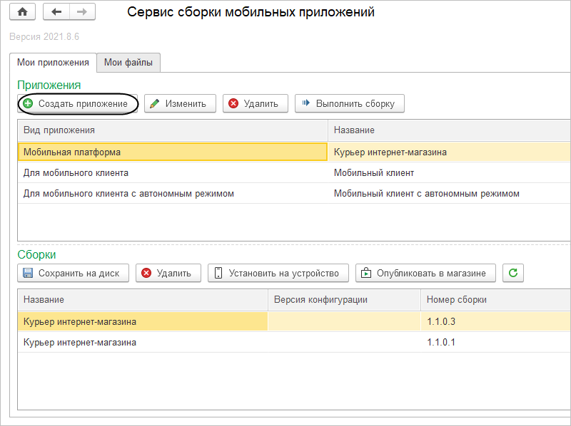 После этого вы увидите все собранные вами приложения в верхней таблице Приложения. При выделении строки с конкретным приложением в нижней таблице Сборки будет показан список всех сделанных вами сборок этого приложения.