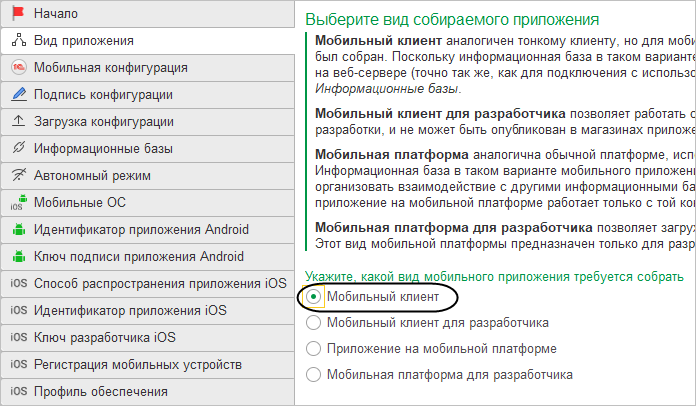 На странице Вид приложения укажите вид собираемого приложения — Мобильный клиент.