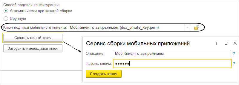 На странице Подпись конфигурации нужно задать уникальный ключ подписи конфигурации, который будет помещен внутрь собранного мобильного приложения. Оставьте способ подписи конфигурации по умолчанию в значении Автоматически при каждой сборке и нажмите кнопку Создать новый ключ. Заполните описание и пароль ключа и нажмите Создать ключ. Пароль запомните, так как им будет подписываться эта конфигурация (или ее новые версии). Созданный вами ключ отобразится в поле Ключ подписи мобильного клиента.