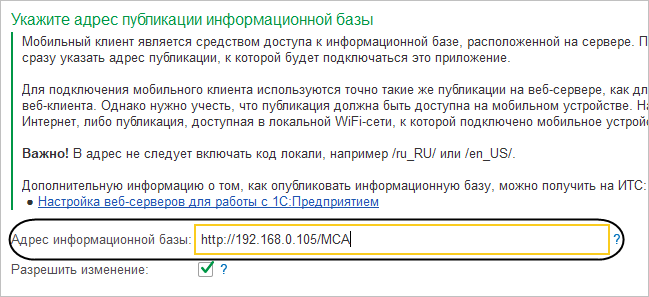На странице Информационные базы укажите адрес, по которому вы публиковали информационную базу на веб-сервере (например, http://192.168.0.105/MCA). В данном случае адрес публикации указан в формате: http://<IP-адрес компьютера в беспроводной сети>/<Каталог веб-сервера, на котором опубликована информационная база>.
