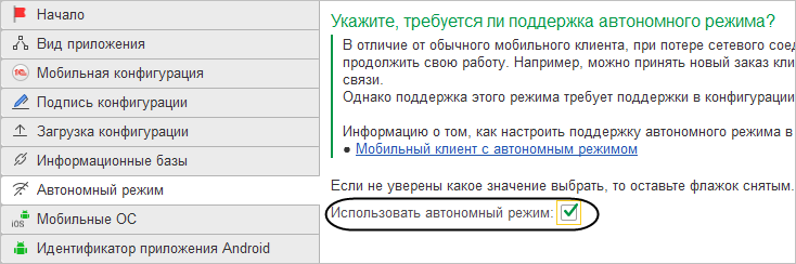 На странице Автономный режим нужно установить флажок Использовать автономный режим, так как вы собираете приложение для мобильного клиента с автономным режимом.