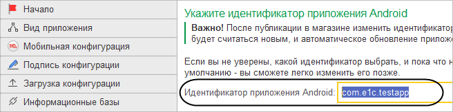 На странице Идентификатор приложения Android задайте строковый идентификатор собираемого приложения в формате <com>.<e1c>.<имя приложения на латинице>.