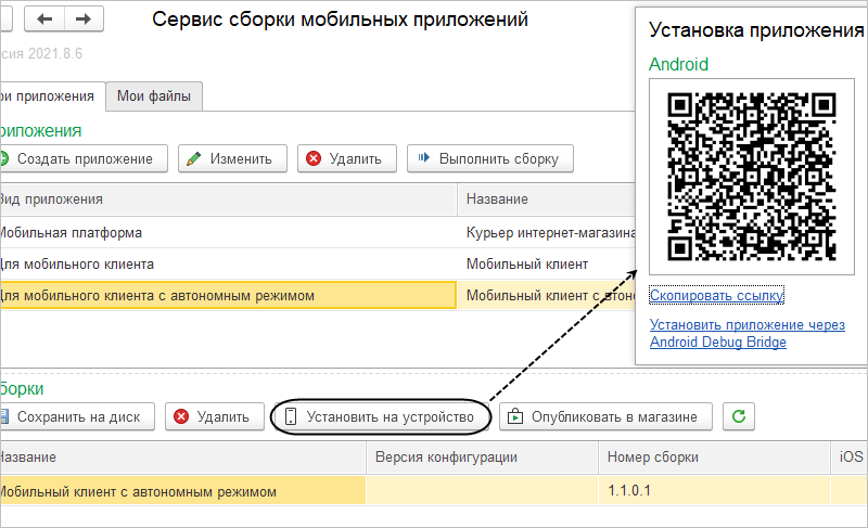 В результате через некоторое время в нижней таблице Сборки появится строка со сборкой вашего приложения. Чтобы установить приложение на мобильное устройство, выделите эту строку и нажмите кнопку Установить на устройство. В появившемся окне отсканируйте QR-код для приложения Android или просто скопируйте ссылку, нажав Скопировать ссылку, и затем передайте ее на мобильное устройство.