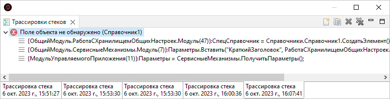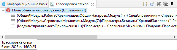 Панель Трассировки стеков позволяет анализировать стеки вызовов кода на встроенном языке, например, после аварийного завершения.