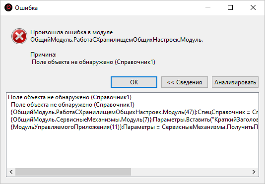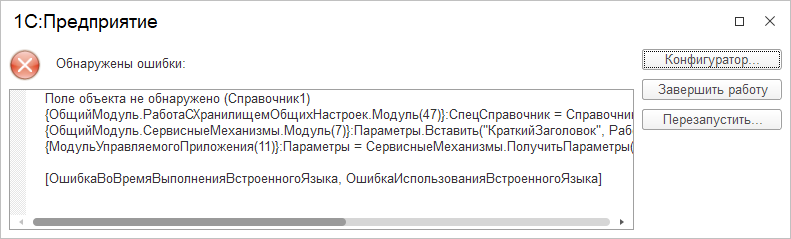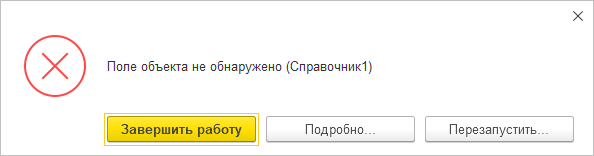 При аварийном завершении приложения платформа отображает окно с кратким сообщением об ошибке.