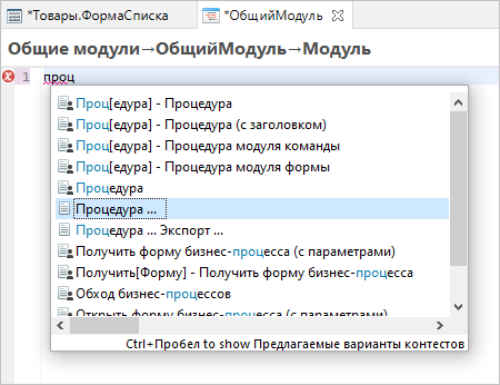 На первой странице контекстной подсказки 1C:EDT предложит вам те шаблоны, в имени которых содержится строка, введенная вами в модуле.