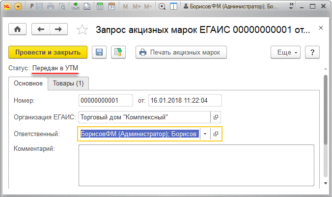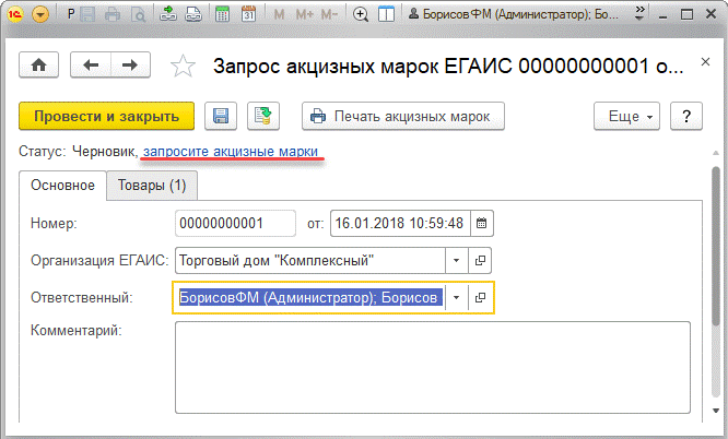 Здесь требуется указать организацию, на которой числится данный товар и ответственного за документ. Документ после сохранения примет статус Черновик, запросите акцизные марки.Рис. 2
