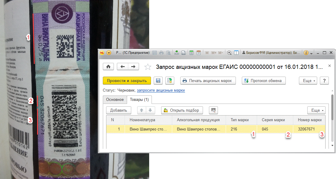 В «1С: Розница 8», при повреждении марки, данный код можно запросить в ЕГАИС, распечатать на этикетке и наклеить на товар. Для этого предназначен документ Запрос акцизных марок ЕГАИС.