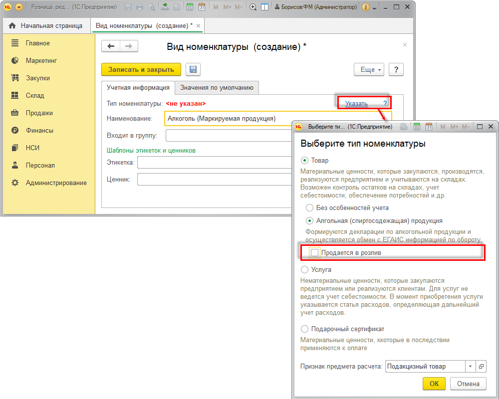 - В открывшемся окне Выберите тип номенклатуры установить переключатели в значение Товар и Алкогольная (спиртосодержащая) продукция.