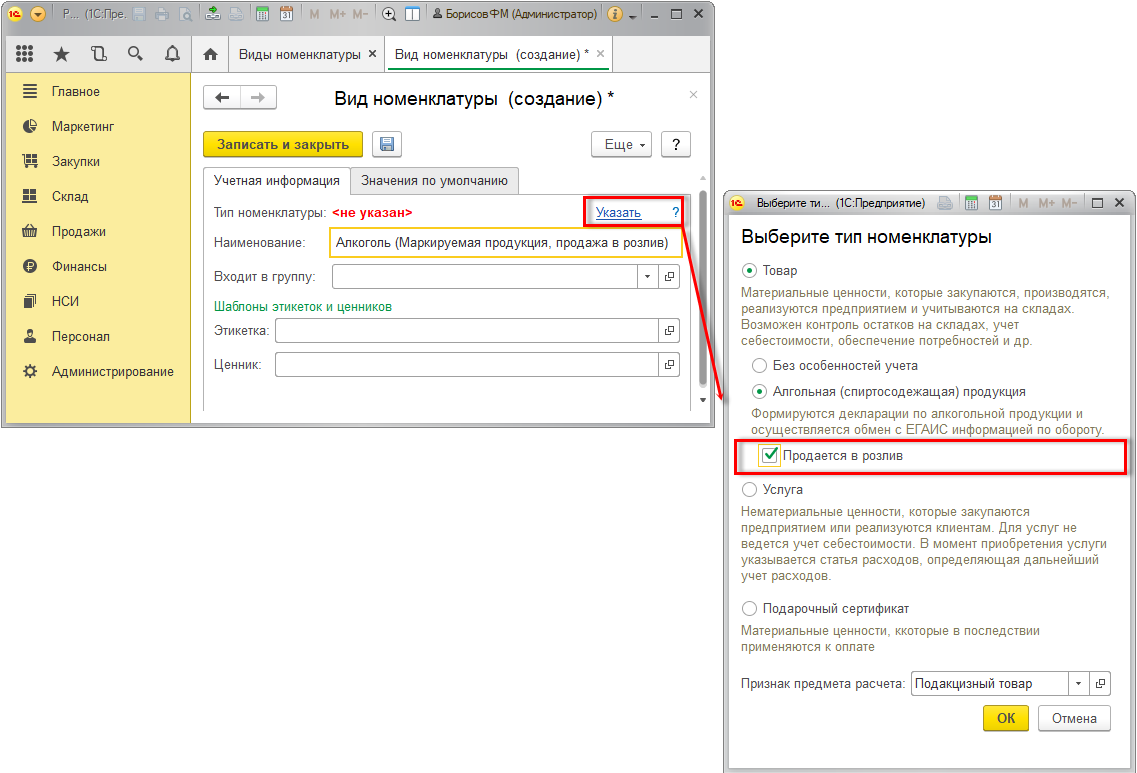 Алкогольная продукция, продаваемая в розлив и числящаяся в закрытой таре, в справочнике Номенклатура должна быть отражена отдельными позициями с разными видами номенклатуры.