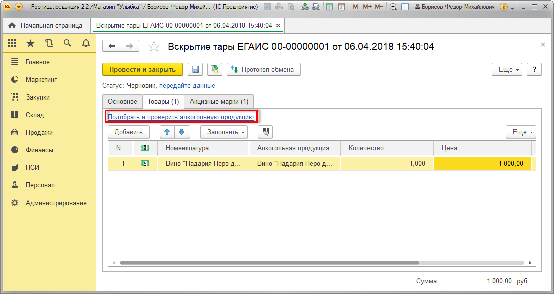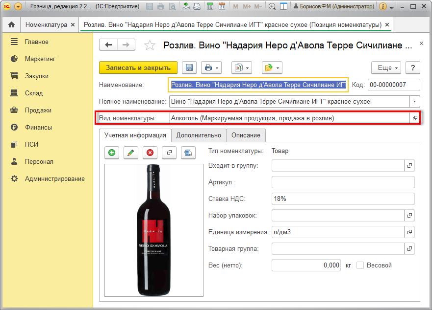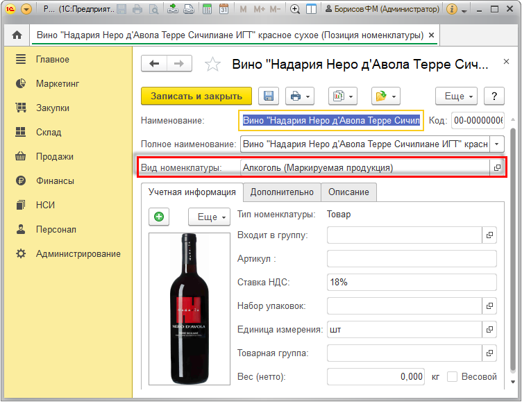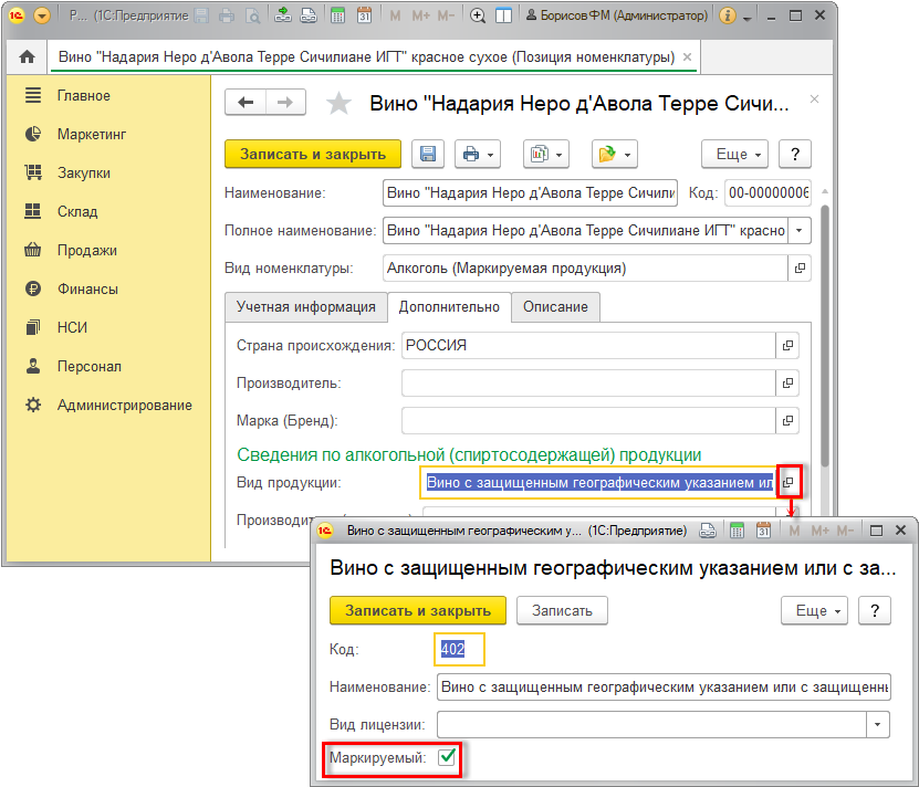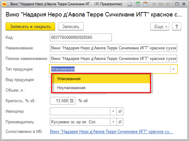 Исходная алкогольная маркируемая продукция в закрытой таре, которую мы ранее купили или оприходовали на склад, настроена следующим образом: