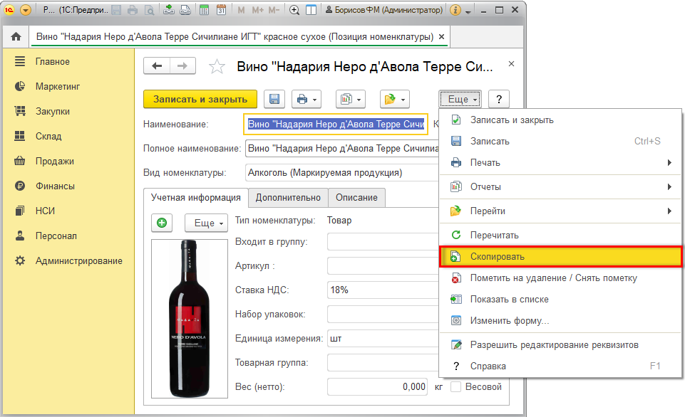 - В справочнике Номенклатура скопировать исходную маркируемую продукцию в закрытой таре.