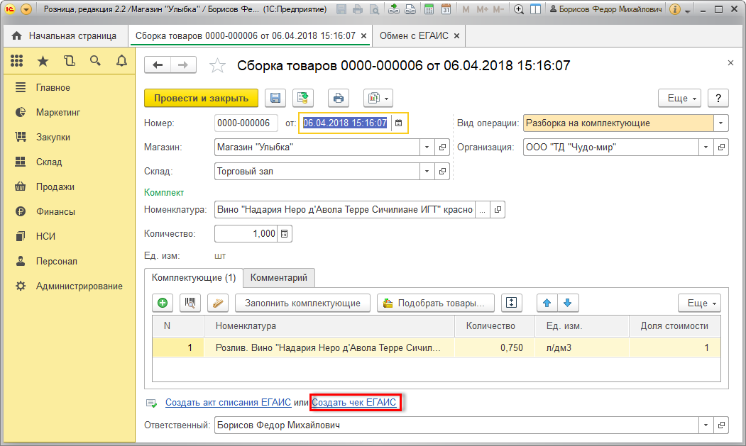 | 1 | Вскрытие тары | Сборка товаров | В закрытой таре | "-" | Чек ЕГАИС (Вскрытие тары) | |