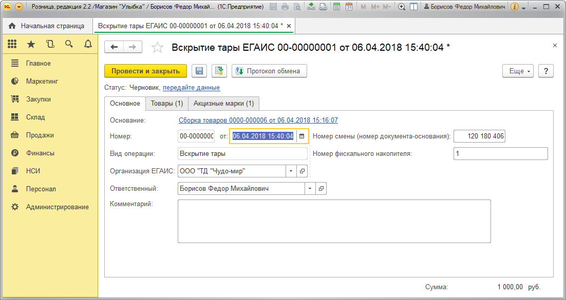 - Откроется форма документа Вскрытие тары ЕГАИС.