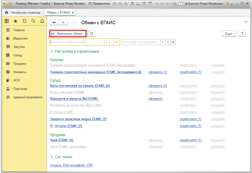 - В рабочем месте Обмен с ЕГАИС (раздел НСИ – Сервис).