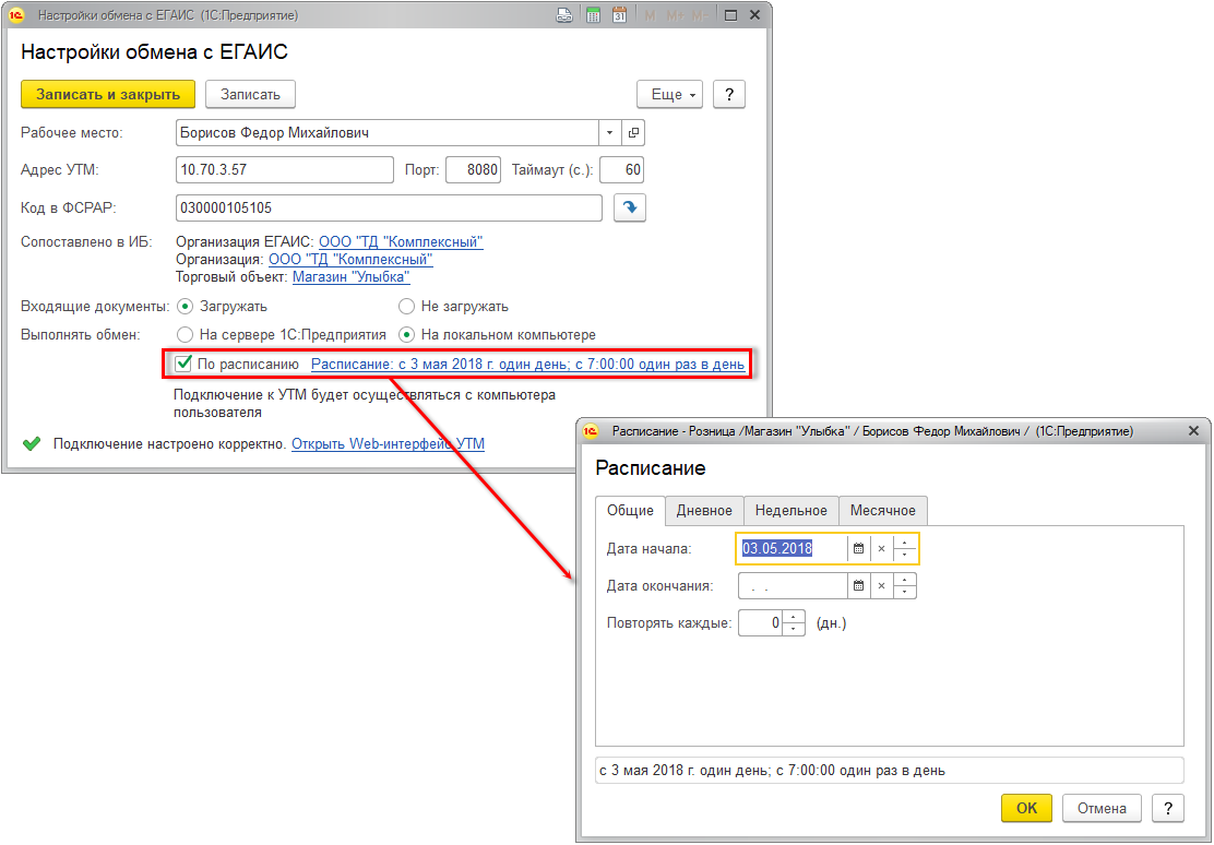 В текущем окне Настройка обмена с ЕГАИС установить расписание обмена.