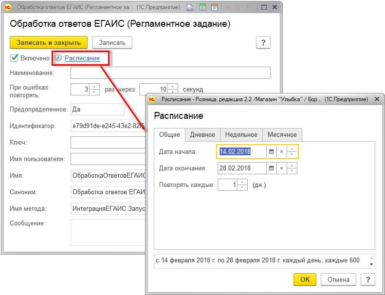 Для установки расписания следует перейти в раздел Администрирование – Обслуживание – Регламентные операции – Регламентные и фоновые задания – Обработка ответов ЕГАИС и в текущем диалоговом окне установить расписание.