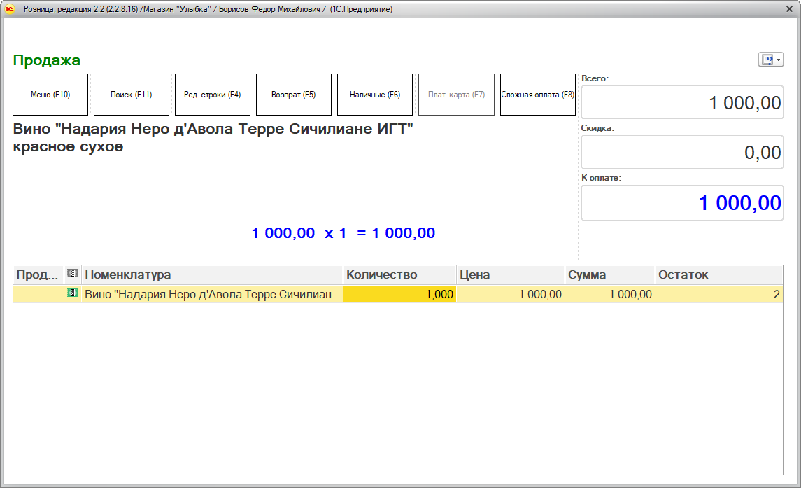 В "1С:Рознице 8" кассир оформляет розничные продажи в режиме работы РМК (раздел Продажи – Сервис – РМК (управляемый режим)), с помощью 2D-сканера считывает штрихкод ФСМ/АМ.